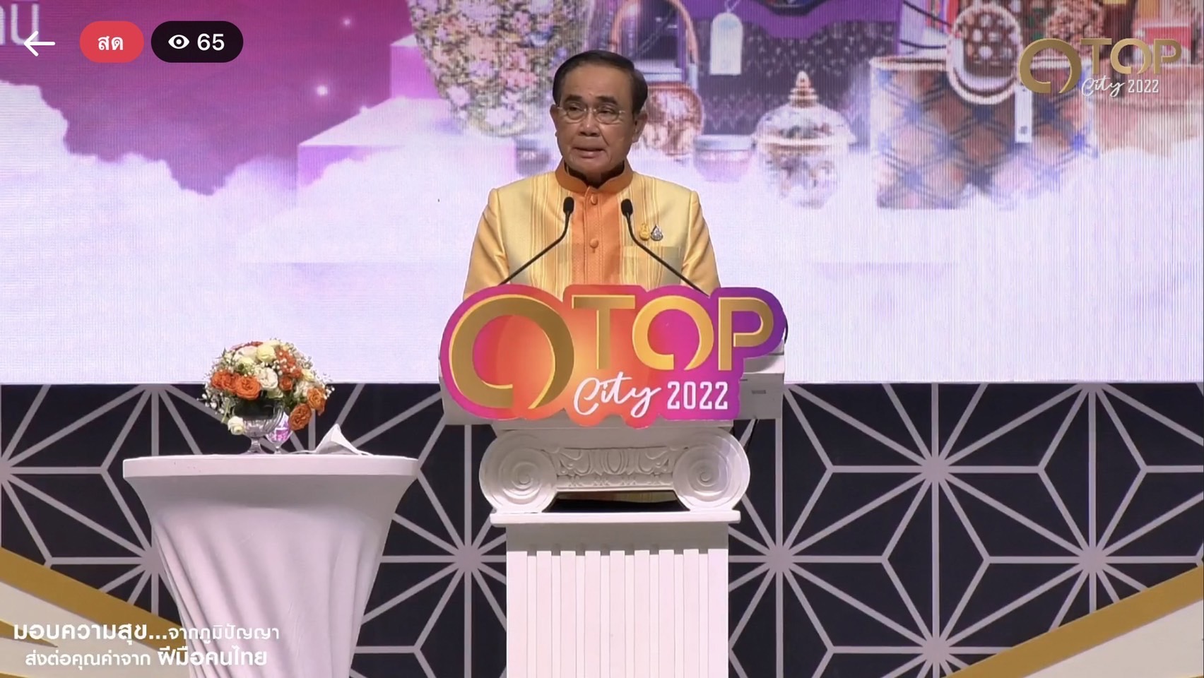 ? พลเอก ประยุทธ์ จันทร์โอชา นายกรัฐมนตรี เป็นประธานในพิธีเปิดงาน OTOP CITY 2022 : มอบความสุข…จากภูมิปัญญา ส่งต่อคุณค่าจากฝีมือคนไทย โดยมีพลเอกอนุพงษ์ เผ่าจินดา รัฐมนตรีว่าการกระทรวงมหาดไทย เป็นผู้กล่าวกล่าวรายรายงาน โดยมี รองศาสตราจารย์นราพร จันทร์โอชา ภริยานายกรัฐมนตรี นายดอน ปรมัตถ์วินัย รองนายกรัฐมนตรีและรัฐมนตรีว่าการกระทรวงการต่างประเทศ นายชัยวุฒิ ธนาคมานุสรณ์ รัฐมนตรีว่าการกระทรวงดิจิทัลเพื่อเศรษฐกิจและสังคม นายทรงศักดิ์ ทองศรี รัฐมนตรีช่วยว่าการกระทรวงมหาดไทย นายสุทธิพงษ์ จุลเจริญ ปลัดกระทรวงมหาดไทย ดร.วันดี กุญชรยาคง จุลเจริญ นายกสมาคมแม่บ้านมหาดไทย ท่านผู้หญิงกอบกุล อุบลเดชประชารักษ์ ผู้ช่วยงานส่งเสริมศิลปาชีพ มูลนิธิส่งเสริมศิลปาชีพในสมเด็จพระนางเจ้าสิริกิติ์ พระบรมราชินีนาถ พระบรมราชชนนีพันปีหลวง นายประทีป กีรติเรขา รองเลขาธิการนายกรัฐมนตรีฝ่ายการเมือง นายอนุชา บูรพชัยศรี รองเลขาธิการนายกรัฐมนตรีฝ่ายการเมืองปฏิบัติหน้าที่โฆษกประจำสำนักนายกรัฐมนตรี นายอรรษิษฐ์ สัมพันธรัตน์ อธิบดีกรมการพัฒนาชุม นางจิณณารัชช์ สัมพันธรัตน์ ประธานชมรมแม่บ้านพัฒนาชุมชน นายประวิช สุขุม ผู้ช่วยกรรมการผู้อำนวยการใหญ่ บริษัท ไทยเบฟเวอเรจ จำกัด (มหาชน) เลขานุการทีมภาคเอกชน คณะทำงานการพัฒนาเศรษฐกิจฐานรากและประชารัฐ คณะทูตานุทูต ผู้ว่าราชการจังหวัด หัวหน้าส่วนราชการ และภาคีเครือข่าย ร่วมในพิธีตลอดจนคณะผู้บริหาร ข้าราชการ ในสังกัดกรมการพัฒนาชุมชน ร่วมเป็นเกียรติเข้าร่วมในพิธีเปิดงานฯ