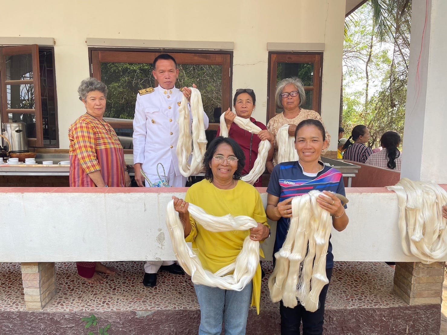 ? 3) แบ่งกลุ่มฝึกปฏิบัติ การเตรียมเส้น การคัดเลือกและต้มพืชพันธุ์ไม้ที่ให้สีธรรมชาติ การฟอกไหม-ผ้ามัดย้อม และการย้อมสีธรรมชาติด้วยใบขี้เหล็ก ซึ่งพืชประจำจจังหวัดชัยภูมิ