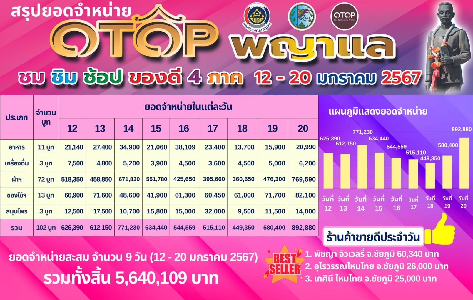โดยมียอดจำหน่ายสินค้าผลิตภัณฑ์ OTOP ในวันที่ 20 มกราคม 2567 จำนวน 892,880 บาท โดยมีรายละเอียด ดังนี้