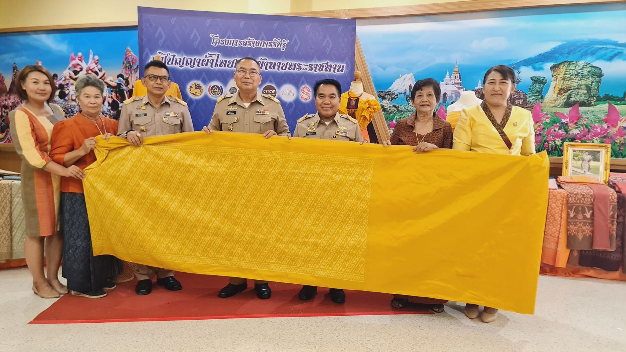นาย อนันต์ นาคนิยม ผู้ว่าราชการจังหวัดชัยภูมิ มอบหมายให้ สำนักงานพัฒนาชุมชนจังหวัดชัยภูมิ โดยการนำของ นายโดมทอง ดิเรกศิลป์ พัฒนาการจังหวัดชัยภูมิ นำผู้ผลิต ผู้ประกอบการ OTOP ประเภทผ้าภายในจังหวัดชัยภูมิ จำนวน 8 กลุ่ม จากพื้นที่ 6 อำเภอ ได้แก่ กลุ่มทอผ้าไหมบ้านเสี้ยวน้อย อำเภอเมืองชัยภูมิ กลุ่มสตรีทอผ้าบ้านหนองบัวเพวัง เครือข่ายกลุ่มมัดหมี่ทอผ้าตำบลบ้านโสกอำเภอคอนสวรรค์ กลุ่มทอผ้าบ้านเขว้าวัฒนา เครือข่ายกลุ่มทอผ้าไหมตำบลบ้านเขว้า อำเภอบ้านเขว้า กลุ่มทอผ้าบ้านโนนตุ่น อำเภอภูเขียว กลุ่มทอผ้าบ้านโนนสวนปอ อำเภอหนองบัวแดง และกลุ่มทอผ้าพื้นเมืองบ้านนาแก อำเภอแก้งคร้อ ร่วมแสดงและจำหน่ายผ้าลายพระราชทาน ได้แก่