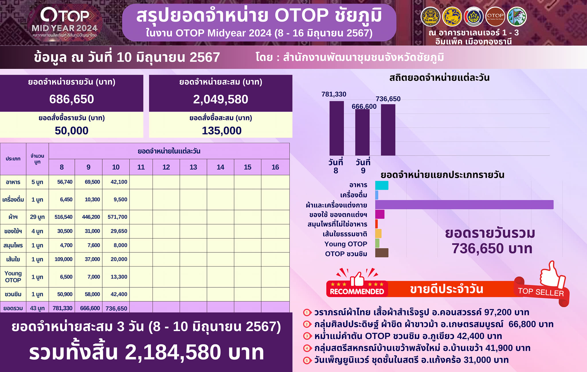 จังหวัดชัยภูมิ มีผู้ผลิต ผู้ประกอบการ OTOP ที่นำสินค้าผลิตภัณฑ์ชุมชนร่วมจัดแสดงและจำหน่ายสินค้าผลิตภัณฑ์ชุมชน ในงาน OTOP MID YEAR 2024 รวมทั้งสิ้นจำนวน 43 บูท โดยมียอดจำหน่ายและยอดสั่งซื้อสะสมรวม 3 วัน (ระหว่างวันที่ 8 – 10 มิถุนายน 2567) จำนวน 2,049,580 บาท ซึ่งมียอดจำหน่ายในวันที่ 10 มิถุนายน 2567 จำนวน 686,650 บาท ซึ่งมีรายละอียด ดังนี้