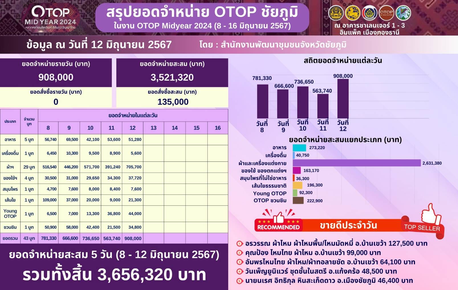 จังหวัดชัยภูมิ มีผู้ผลิต ผู้ประกอบการ OTOP ที่นำสินค้าผลิตภัณฑ์ชุมชนร่วมจัดแสดงและจำหน่ายสินค้าผลิตภัณฑ์ชุมชน ในงาน OTOP MID YEAR 2024 รวมทั้งสิ้นจำนวน 43 บูท โดยมียอดจำหน่ายและยอดสั่งซื้อสะสมรวม 5 วัน (ระหว่างวันที่ 8 – 12 มิถุนายน 2567) จำนวน 3,656,320 บาท ซึ่งมียอดจำหน่ายในวันที่ 12 มิถุนายน 2567 จำนวน 908,000 บาท ซึ่งมีรายละอียด ดังนี้