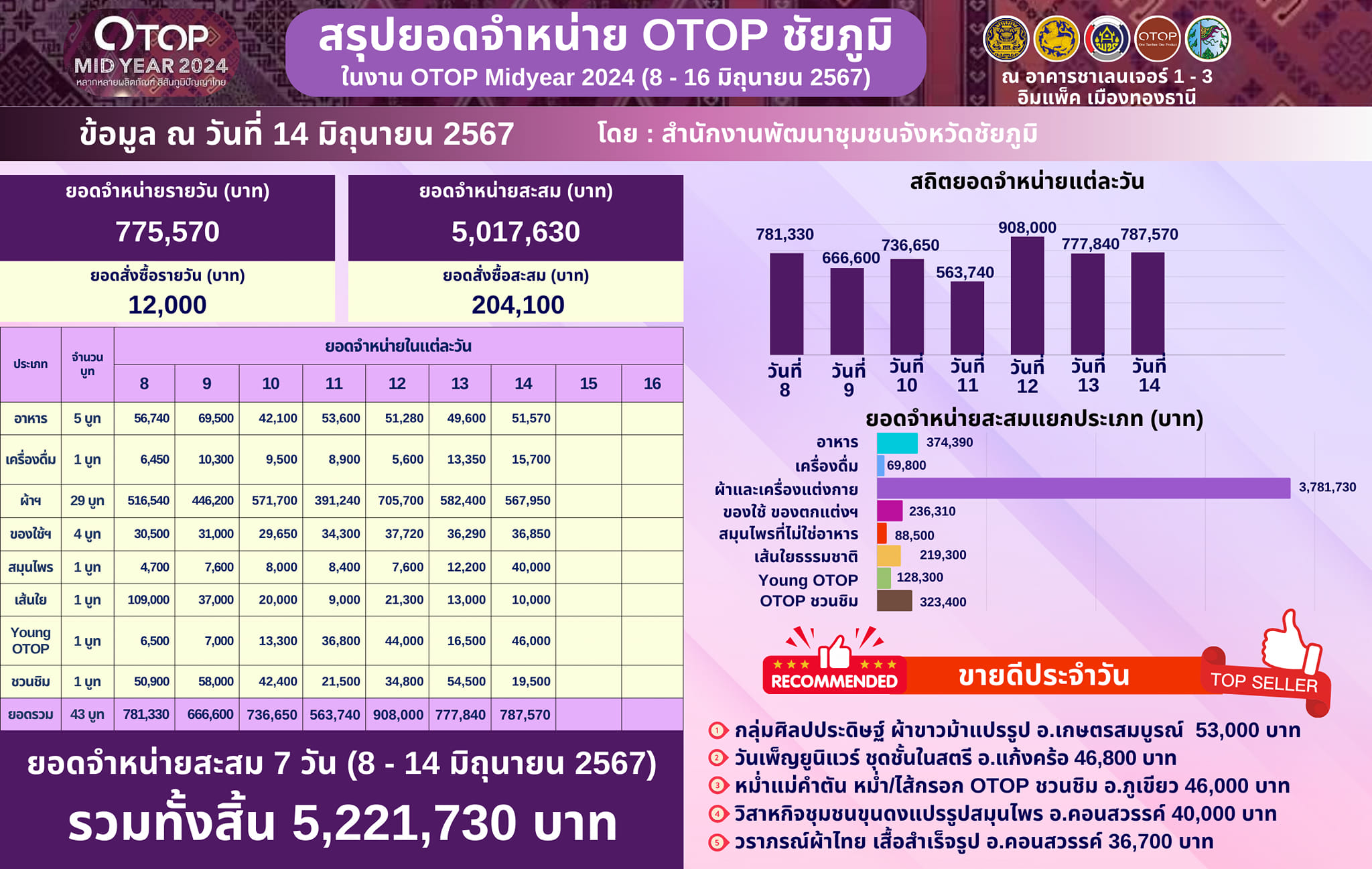 จังหวัดชัยภูมิ มีผู้ผลิต ผู้ประกอบการ OTOP ที่นำสินค้าผลิตภัณฑ์ชุมชนร่วมจัดแสดงและจำหน่ายสินค้าผลิตภัณฑ์ชุมชน ในงาน OTOP MID YEAR 2024 รวมทั้งสิ้นจำนวน 43 บูท โดยมียอดจำหน่ายและยอดสั่งซื้อสะสมรวม 7 วัน (ระหว่างวันที่ 8 – 14 มิถุนายน 2567) จำนวน 5,221,730 บาท ซึ่งมียอดจำหน่ายในวันที่ 14 มิถุนายน 2567 จำนวน 787,570 บาท ซึ่งมีรายละอียด ดังนี้