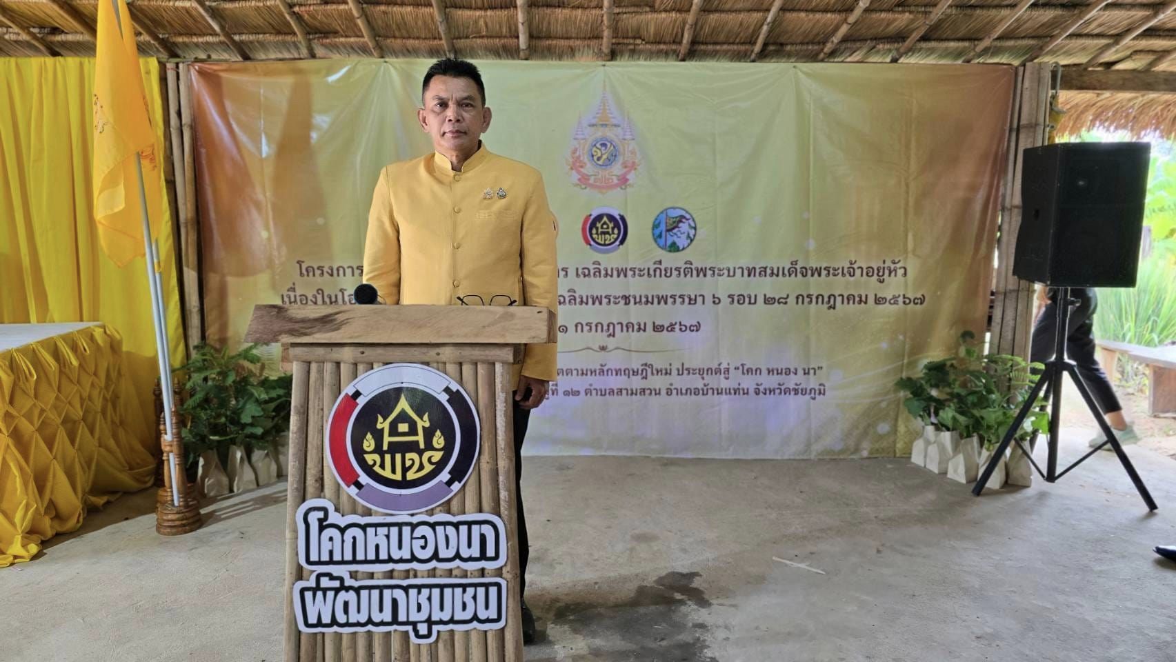 ในการนี้นายโดมทอง ดิเรกศิลป์ พัฒนาการจังหวัดชัยภูมิ กล่าวว่า สำนักงานพัฒนาชุมชนจังหวัดชัยภูมิ ได้คัดเลือกศูนย์เรียนรู้การพัฒนาคุณภาพชีวิตตามหลักทฤษฎีใหม่ ประยุกต์สู่ “โคก หนอง นา” แปลง นางจีรนันท์ ประทีปเมือง หมู่ที่ 12 ตำบลสามสวน อำเภอบ้านแท่น จังหวัดชัยภูมิ แห่งนี้เป็นพื้นที่ดำเนินโครงการ ซึ่งเป็นพื้นที่ที่มีองค์ประกอบทางกายภาพครบถ้วนในรูปแบบ โคก หนอง นา มีกิจกรรมการแลกเปลี่ยนเรียนรู้อย่างต่อเนื่อง และมีผลผลิตที่สร้างอาชีพ สร้างรายได้ให้ชุมชนและเพื่อเป็นการเฉลิมพระเกียรติ พระบาทสมเด็จพระเจ้าอยู่หัว และต่อยอดขยายผล “โคก หนอง นา” สู่การพัฒนาพื้นที่แบบอารยเกษตร ตามแนวพระราชดำริ และเผยแพร่ผลสำเร็จการพัฒนาคุณภาพชีวิตด้วยโคก หนอง นา อารยเกษตร ให้ประชาชนได้รับรู้และมีแนวทางในการนำไปประยุกต์ใช้ในการดำเนินชีวิต จังหวัดชัยภูมิ สำนักงานพัฒนาชุมชนจังหวัดชัยภูมิ จึงได้จัดกิจกรรมเผยแพร่ผลสำเร็จการพัฒนาคุณภาพชีวิต ด้วยโคก หนอง นา อารยเกษตร ขึ้น โดยมีพิธีเปิดป้ายโครงการประดับตราสัญลักษณ์งานเฉลิมพระเกียรติพระบาทสมเด็จพระเจ้าอยู่หัว เนื่องในโอกาส มหามงคลเฉลิมพระชนมพรรษา 6 รอบ 28 กรกฎาคม 2567 กิจกรรม ปลูกต้นรวงผึ้ง ต้นไม้ประจำรัชกาลที่ 10 และแบ่งปันพันธุ์กล้าไม้แก่สถานศึกษา และสำนักงานพัฒนาชุมชนอำเภอ ทั้ง 16 อำเภอ พร้อมการเยี่ยมชมองค์ความรู้ แนวคิดและทฤษฎีของการพัฒนาอันเนื่องมาจากพระราชดำริ และการจัดเวทีเสวนาแลกเปลี่ยนองค์ความรู้ การน้อมนำแนวคิดและทฤษฎีของการพัฒนา อันเนื่องมาจากพระราชดำริ มาประยุกต์ใช้ในพื้นที่