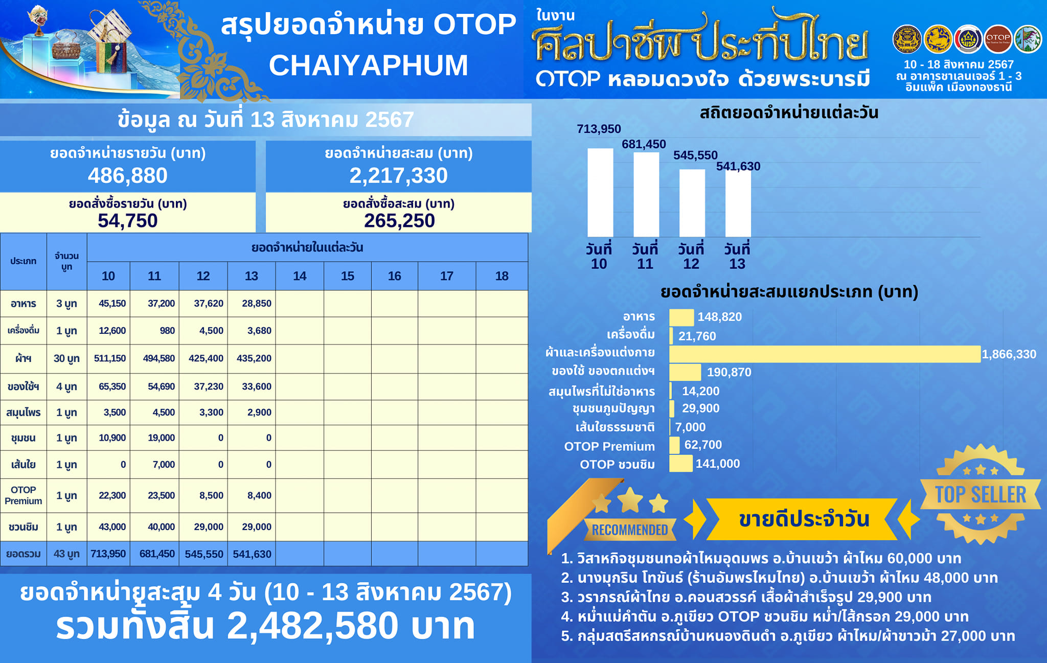 จังหวัดชัยภูมิ มีผู้ผลิต ผู้ประกอบการ OTOP ที่นำสินค้าผลิตภัณฑ์ชุมชนร่วมจัดแสดงและจำหน่ายสินค้าผลิตภัณฑ์ชุมชน ในงาน OTOP ศิลปาชีพประทีปไทย OTOP หลอมดวงใจด้วยพระบารมี รวมทั้งสิ้นจำนวน 43 บูท โดยมียอดจำหน่ายสะสม 4 วัน ระหว่างวันที่ 10 – 13 สิงหาคม 2567 จำนวน 2,482,580 บาท แบ่งเป็นยอดจำหน่ายสะสม จำนวน 2,217,330 บาท ยอดสั่งซื้อสะสม 265,250 บาท ซึ่งมียอดจำหน่าย และยอดสั่งซื้อในวันอังคารที่ 13 สิงหาคม 2567 จำนวน 541,630 บาท แบ่งเป็นยอดจำหน่าย จำนวน 486,880 บาท ยอดสั่งซื้อ จำนวน 54,750 บาท ซึ่งมีรายละอียด ดังนี้