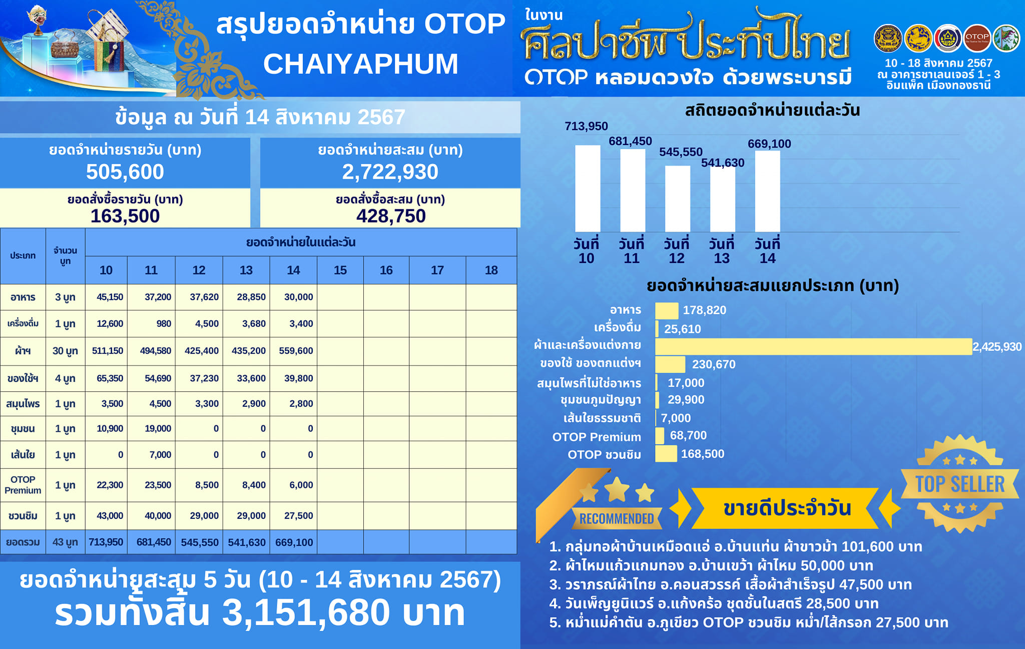 จังหวัดชัยภูมิ มีผู้ผลิต ผู้ประกอบการ OTOP ที่นำสินค้าผลิตภัณฑ์ชุมชนร่วมจัดแสดงและจำหน่ายสินค้าผลิตภัณฑ์ชุมชน ในงาน OTOP ศิลปาชีพประทีปไทย OTOP หลอมดวงใจด้วยพระบารมี รวมทั้งสิ้นจำนวน 43 บูท โดยมียอดจำหน่ายสะสม 5 วัน ระหว่างวันที่ 10 – 14 สิงหาคม 2567 จำนวน 3,151,680 บาท แบ่งเป็นยอดจำหน่ายสะสม จำนวน 2,722,930 บาท ยอดสั่งซื้อสะสม 428,750 บาท ซึ่งมียอดจำหน่าย และยอดสั่งซื้อในวันพุธที่ 14 สิงหาคม 2567 จำนวน 669,100 บาท แบ่งเป็นยอดจำหน่าย จำนวน 505,600 บาท ยอดสั่งซื้อ จำนวน 163,500 บาท ซึ่งมีรายละอียด ดังนี้