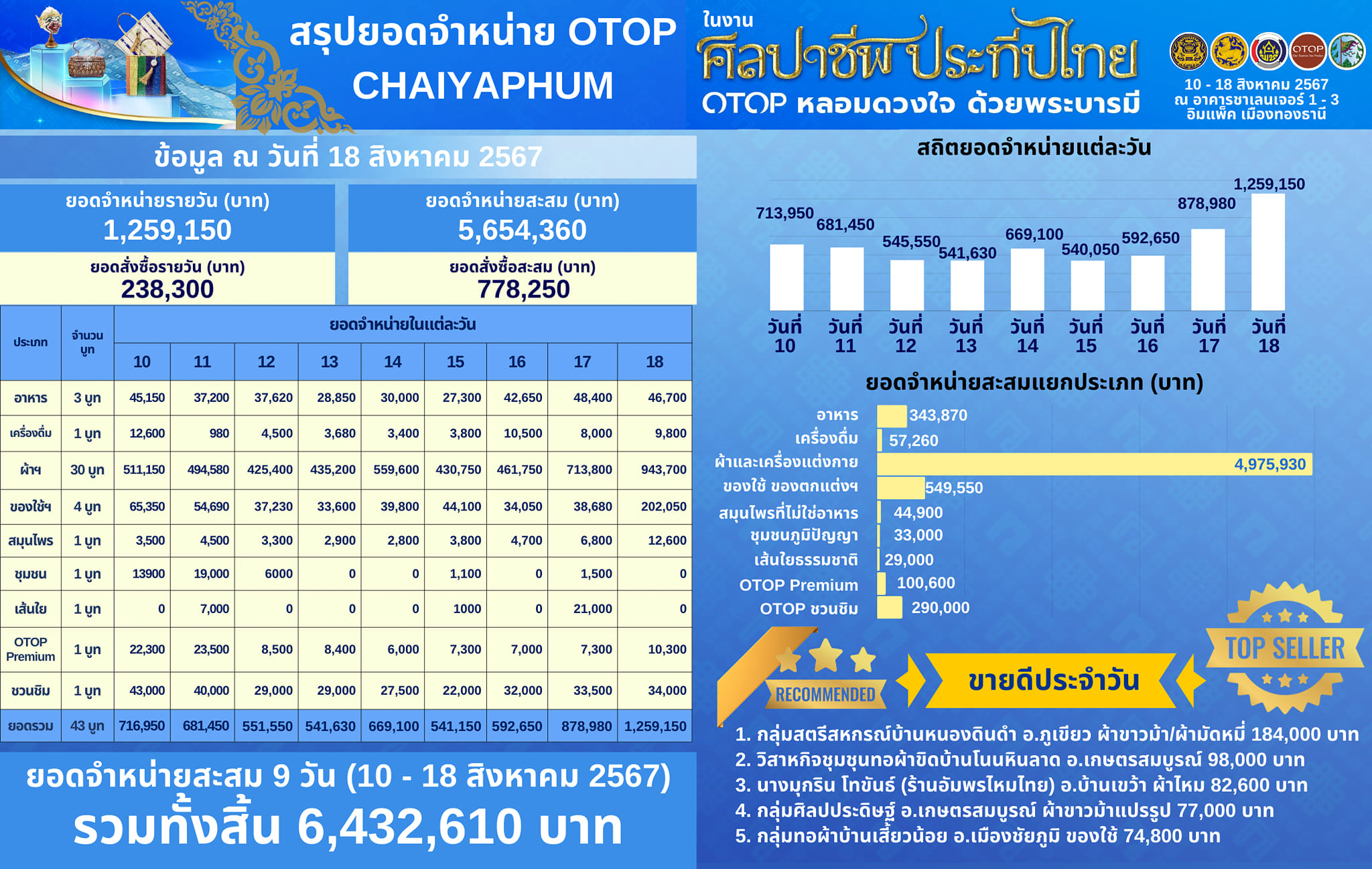 จังหวัดชัยภูมิ มีผู้ผลิต ผู้ประกอบการ OTOP ที่นำสินค้าผลิตภัณฑ์ชุมชน ร่วมจัดแสดงและจำหน่ายสินค้าผลิตภัณฑ์ชุมชน ในงาน OTOP ศิลปาชีพประทีปไทย OTOP หลอมดวงใจด้วยพระบารมี รวมทั้งสิ้นจำนวน 43 บูท โดยมียอดจำหน่ายสะสม 9 วัน ระหว่างวันที่ 10 – 18 สิงหาคม 2567 จำนวน 6,432,610 บาท แบ่งเป็นยอดจำหน่ายสะสม จำนวน 5,654,360 บาท ยอดสั่งซื้อสะสม 778,250 บาท ซึ่งมียอดจำหน่าย และยอดสั่งซื้อในวันอาทิตย์ที่ 18 สิงหาคม 2567 จำนวน 1,259,150 บาท แบ่งเป็นยอดจำหน่าย จำนวน 1,020,850 บาท ยอดสั่งซื้อ จำนวน 238,300 บาท ซึ่งมีรายละอียด ดังนี้