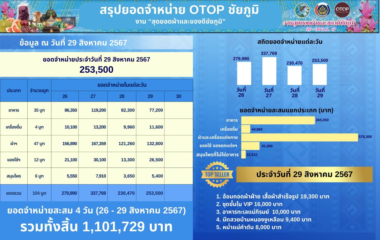 ซึ่งมีผู้ผลิต ผู้ประกอบการ OTOP นำสินค้าผลิตภัณฑ์ชุมชน ร่วมจัดแสดงและจำหน่ายสินค้าผลิตภัณฑ์ชุมชน ในงาน “สุดยอดผ้าและของดีชัยภูมิ” รวมทั้งสิ้นจำนวน 104 บูท โดยมียอดจำหน่ายสะสม 4 วัน ระหว่างวันที่ 26 – 29 สิงหาคม 2567 จำนวน 1,101,729 บาท ยอดจำหน่ายในวันพฤหัสบดีที่ 29 สิงหาคม 2567 จำนวน 253,500 บาท ซึ่งมีรายละอียด ดังนี้
