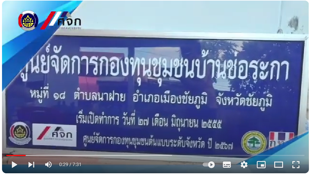 ขอเชิญรับชมวิดีทัศน์การขับเคลื่อนศูนย์จัดการกองทุนชุมชนต้นแบบบ้านช่อระกา หมู่ที่ 18 ตำบลนาฝาย อำเภอเมืองชัยภูมิ จังหวัดชัยภูมิ