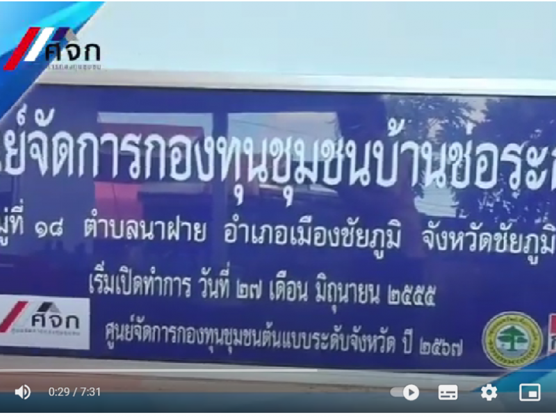 ขอเชิญรับชมวิดีทัศน์การขับเคลื่อนศูนย์จัดการกองทุนชุมชนต้นแบบบ้านช่อระกา หมู่ที่ 18 ตำบลนาฝาย อำเภอเมืองชัยภูมิ จังหวัดชัยภูมิ