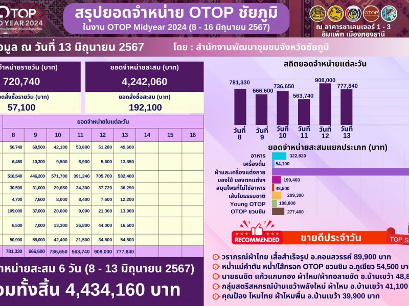 ชัยภูมิ ภูมิใจนำเสนอสินค้าผลิตภัณฑ์ภูมิปัญญาท้องถิ่น ร่วมจัดแสดงและจำหน่ายในงาน OTOP Midyear 2024 เป็นวันที่หก รวมรายได้กว่า 4.4 ล้านบาท