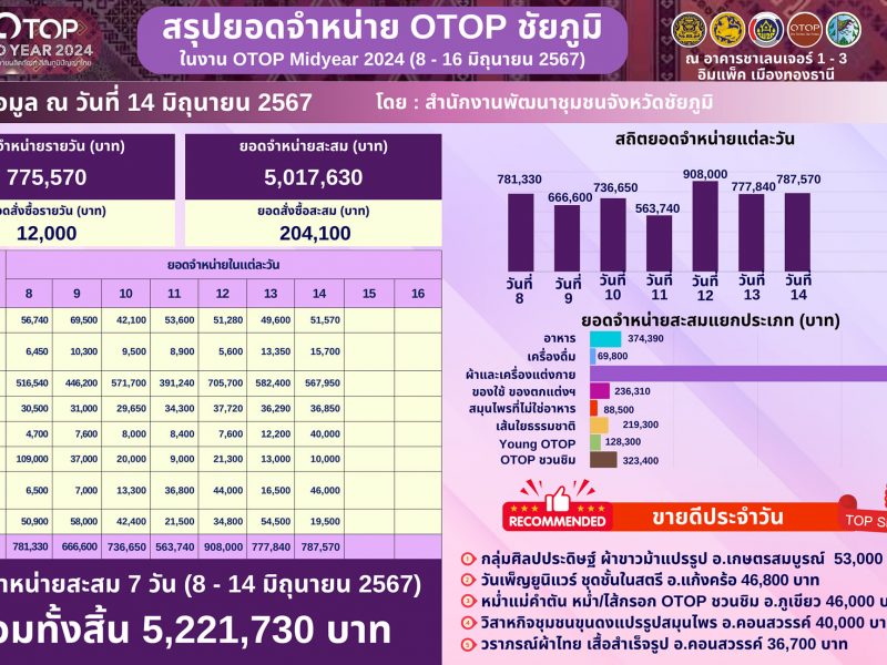 ชาว OTOP ชัยภูมิยิ้มสุขใจ งาน OTOP Midyear 2024 วันที่ 7 ชัยภูมิ โกยรายได้ 7.8 แสนบาท รวมรายได้ทะลุ 5 ล้าน