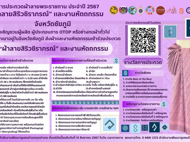 เชิญชวนชาวชัยภูมิร่วมประกวดผ้าลายพระราชทาน “ผ้าลายสิริวชิราภรณ์” ประจำปี 2567