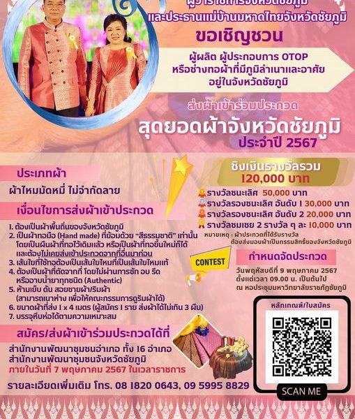 จังหวัดชัยภูมิ ขอเชิญชวนกลุ่มผู้ผลิต ผู้ประกอบการ OTOP ร่วมประกวดสุดยอดผ้าจังหวัดชัยภูมิ ประจำปี 2567 ยื่นใบสมัคร และ ส่งผ้าเข้าประกวด ได้ตั้งแต่บัดนี้ – 7 พฤษภาคม 2567